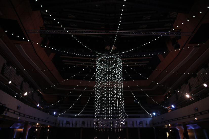 A central LED candelabra reached from the ground, in varying lengths, towards the ceiling, where a web of LED festoons reached out across the room.